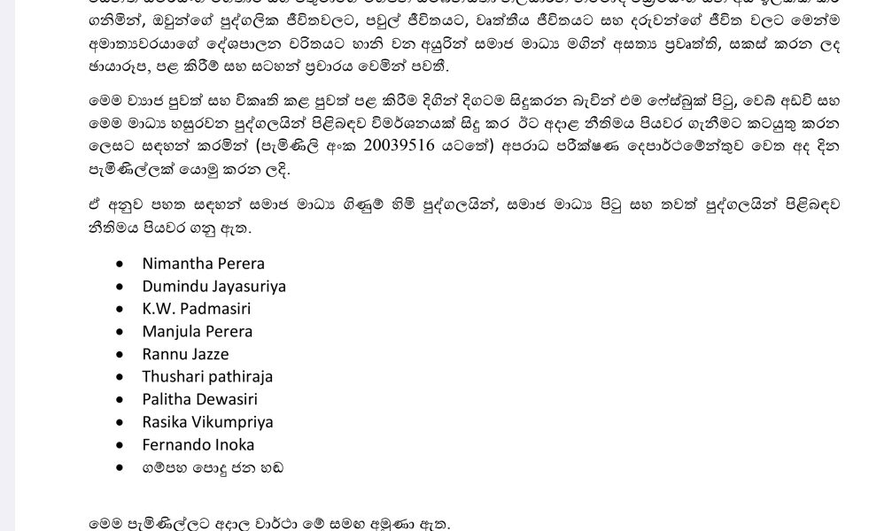 Among those named in the complaint are Nimantha Perera, Dumindu Jayasuriya, K.W. Padmasiri, Manjula Perera, Rannu Jazze, Thushari Pathiraja, Palitha Dewasiri, Rasika Vikumpriya, Fernando Inoka, and the “Gampaha Podu Jana Handa” Facebook page. (Newswire)