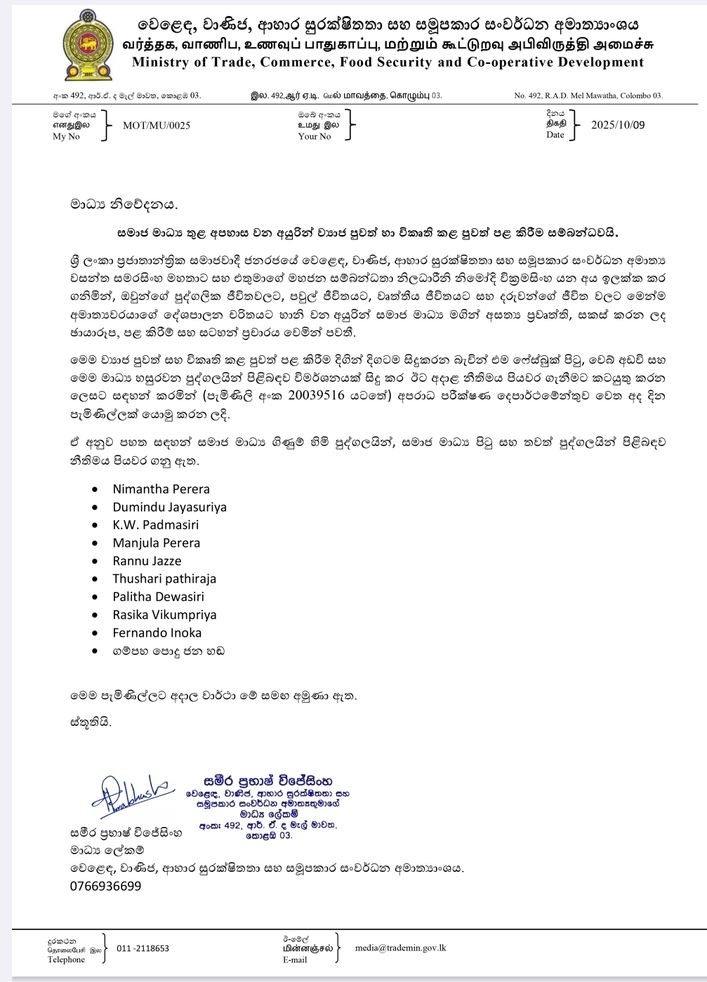 The Ministry of Trade, Commerce, Food Security and Cooperative Development has lodged a complaint with the Criminal Investigation Department (CID) over the circulation of false and defamatory social media posts targeting Minister W.A. Samarasinghe and his public relations officer, Nimodie Wickramasinghe.