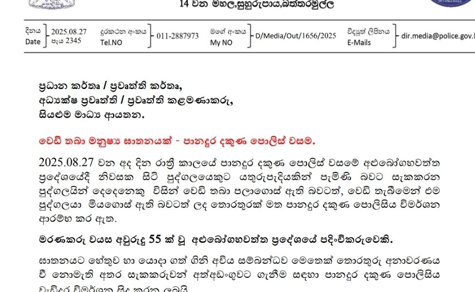 The post 55 year old shot dead in Panadura appeared first on Newswire.