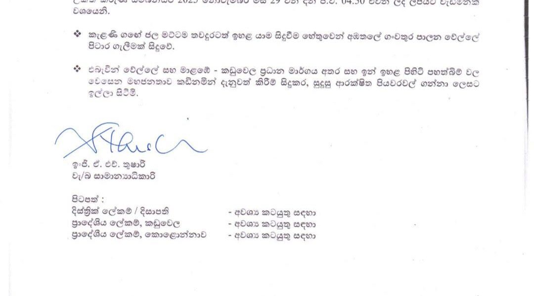 According to officials, the situation presents a significant risk to surrounding low-lying communities, prompting an urgent evacuation order for residents in the Malabe–Kaduwela stretch and adjacent vulnerable areas.
