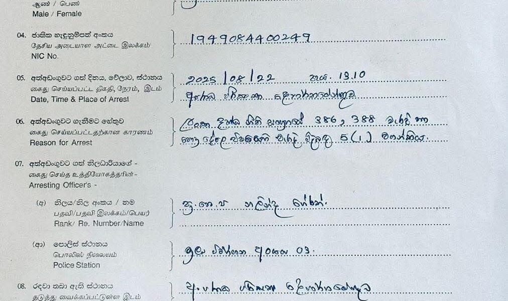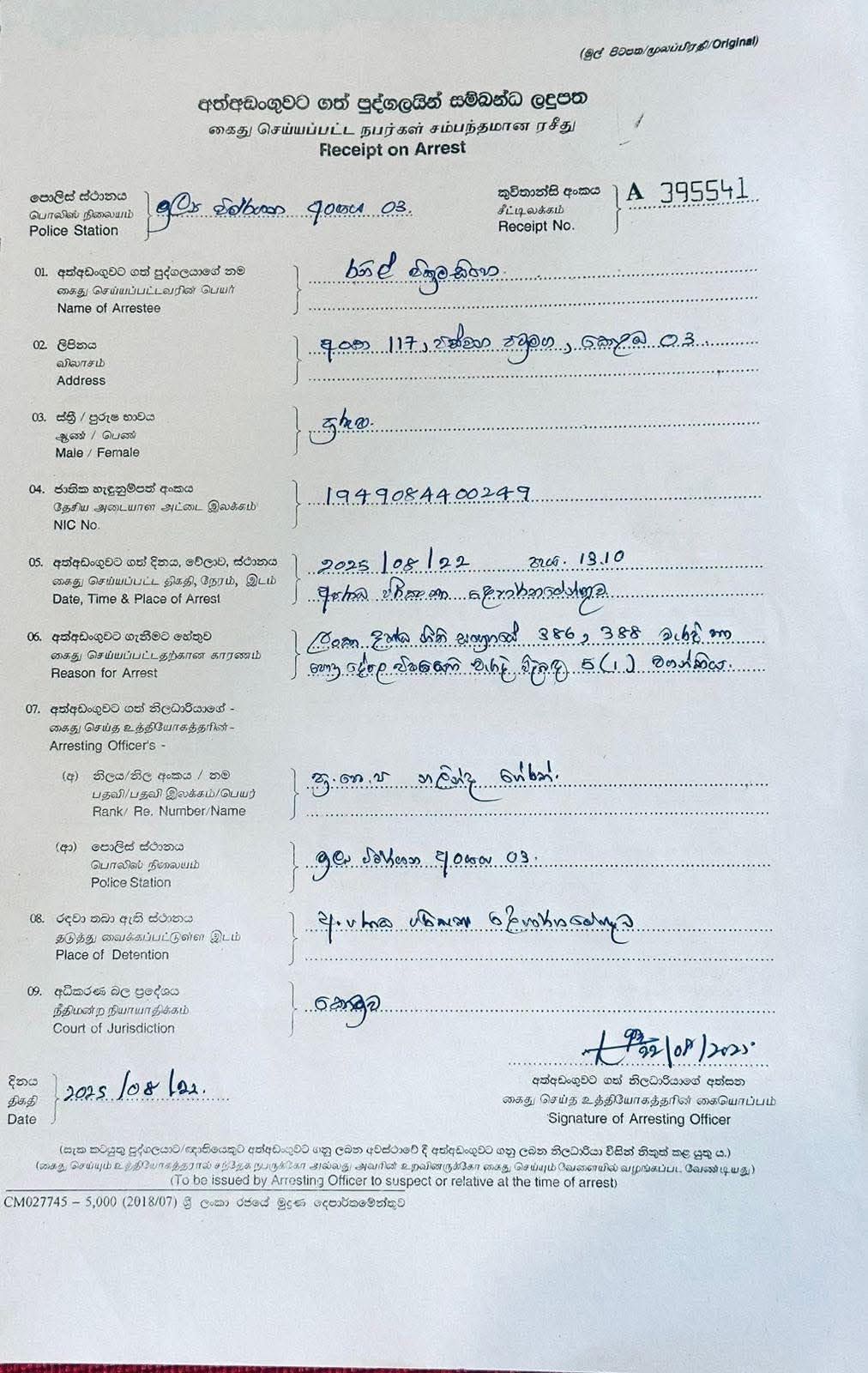 The arrest receipt issued to former President Ranil Wickremesinghe following his detention by the Criminal Investigation Department (CID) states that he has been accused of committing offenses under Section 5(1) of the Public Property Act and Sections 386 and 388 of the Penal Code.