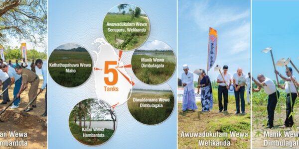 Sampath Bank Begins Restoration of Another Five Tanks to Uplift 1,112 Farming Families Across 2,182 Acres of Paddy Lands The groundbreaking ceremonies of the five tanks from left to right: Kethathapahuwa Wewa Maho, Katan Wewa Hambantota, Awuwadukulam Wewa Welikanda, Manik…