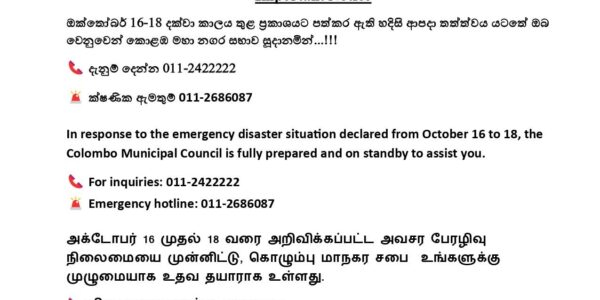 The Colombo Municipal Council (CMC) has declared an emergency disaster response from October 16 to 18, following forecasts of heavy rainfall and possible thunderstorms across Colombo and surrounding areas. The CMC announced that its disaster management and emergency response units…