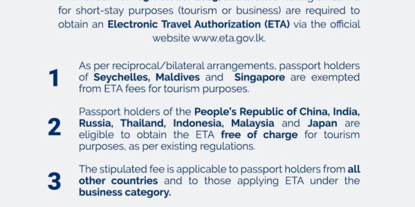 𝙈𝙖𝙣𝙙𝙖𝙩𝙤𝙧𝙮 𝙀𝙡𝙚𝙘𝙩𝙧𝙤𝙣𝙞𝙘 𝙏𝙧𝙖𝙫𝙚𝙡 𝘼𝙪𝙩𝙝𝙤𝙧𝙞𝙯𝙖𝙩𝙞𝙤𝙣 (𝙀𝙏𝘼) 𝙛𝙤𝙧 𝙎𝙝𝙤𝙧𝙩-𝙎𝙩𝙖𝙮 𝙑𝙞𝙨𝙞𝙩𝙤𝙧𝙨 𝙩𝙤 𝙎𝙧𝙞 𝙇𝙖𝙣𝙠𝙖. All travelers visiting Sri Lanka for short-stay purposes (tourism or business) are required to obtain an Electronic Travel Authorization (ETA) prior to arrival. For more details, please visit: www.eta.gov.lk…