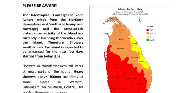 The Department of Meteorology has issued an Amber Advisory for heavy rain affecting the Western, Sabaragamuwa, Southern, Central, Uva, and North-Western provinces, valid until 8:30 a.m. on October 16. According to the advisory issued at 3:00 p.m. today (15) by…