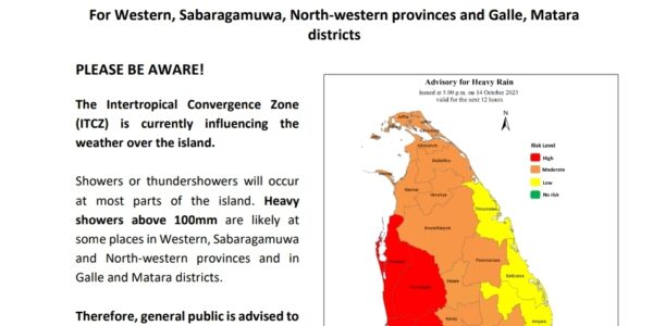The Intertropical Convergence Zone (ITCZ) is currently influencing the weather over the island. Showers or thundershowers will occur in most parts of the island. Heavy showers above 100mm are likely at some places in Western, Sabaragamuwa and North-western provinces and…