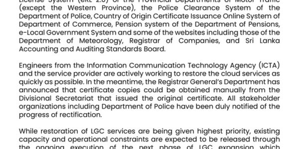 Several government online services hosted on the Lanka Government Cloud (LGC) have been temporarily disrupted due to a technical issue, the Information and Communication Technology Agency (ICTA) said Monday. The affected systems include the Birth, Marriage and Death (BMD) Certificate…