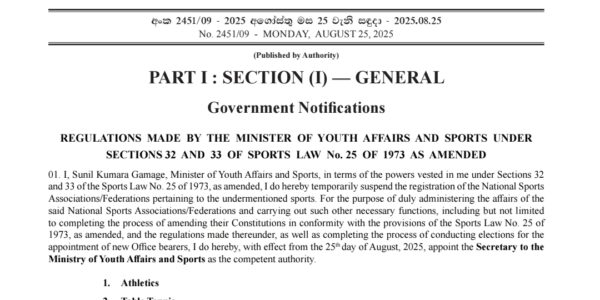 An extraordinary gazette has been issued temporarily suspending the registration of three national sports associations in Sri Lanka. According to the gazette, the Ministry of Youth Affairs and Sports has suspended the registration of the Athletics, Table Tennis, and Gymnastics…