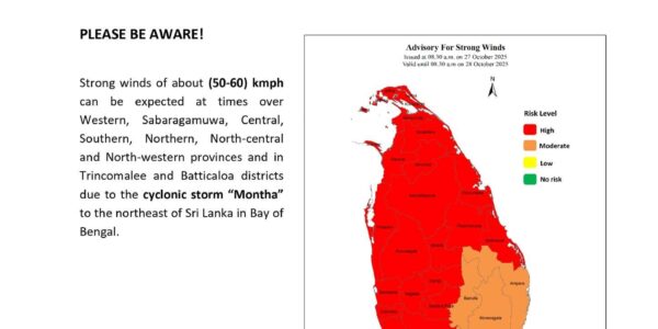 Strong winds of about (50-60) kmph can be expected at times over Western, Sabaragamuwa, Central, Southern, Northern, North-central and North-western provinces and in Trincomalee and Batticaloa districts due to the cyclonic storm “Montha” to the northeast of Sri Lanka in…