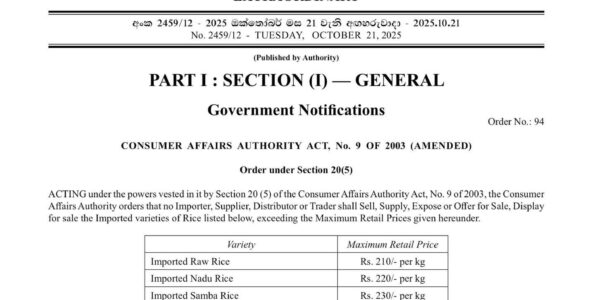 Maximum Retail Prices for Imported Rice – Effective from 21st October 2025. The Consumer Affairs Authority has issued an Order under Section 20(5) of the CAA Act No. 9 of 2003 setting maximum retail prices for imported rice varieties. •…