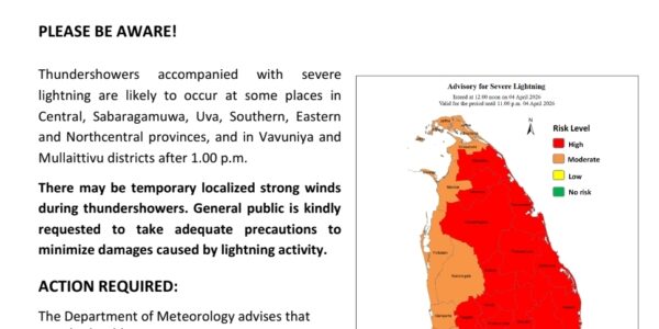 Thundershowers accompanied with severe lightning are likely to occur at some places in Central, Sabaragamuwa, Uva, Southern, Eastern and Northcentral provinces, and in Vavuniya and Mullaittivu districts after 1.00 p.m. There may be temporary localized strong winds during thundershowers. General public is kindly requested to take…