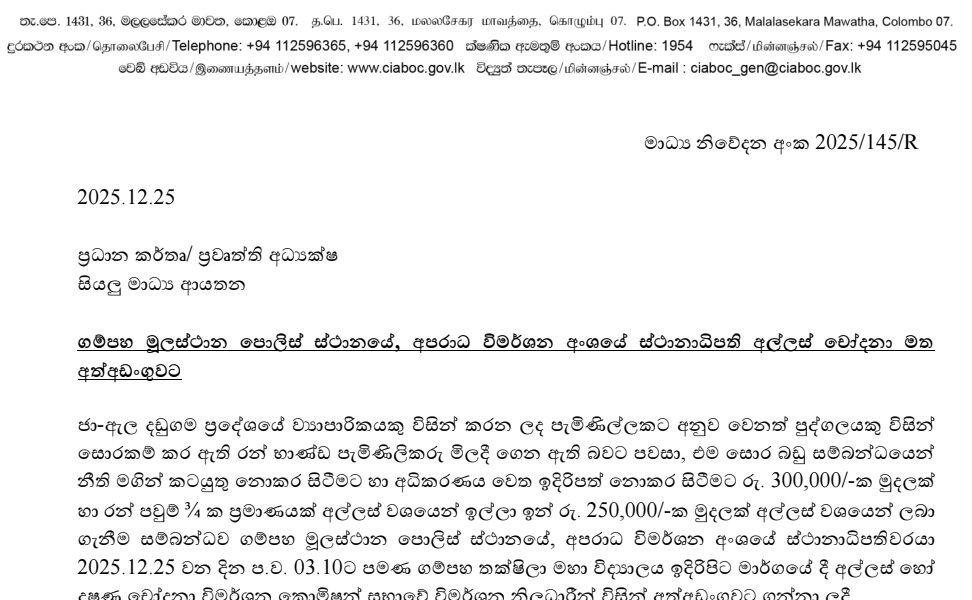 According to CIABOC, the arrest followed a complaint made by a businessman from the Dandugama area in Ja-Ela. The suspect is accused of demanding a bribe of Rs. 300,000 and three-quarter gold sovereigns in exchange for refraining from taking legal action and failing to produce the complainant before court in connection with allegedly stolen gold jewellery.