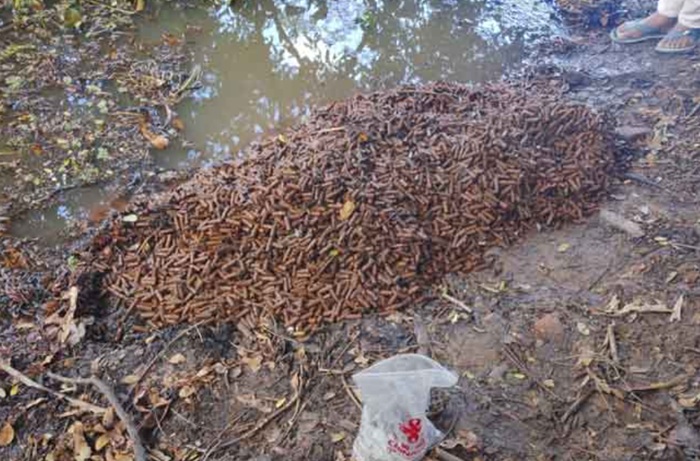 A stockpile of empty bullet casings and live ammunition was discovered today (14) near Mudunegama School, along the Thalawa–Rathmalgahawewa Road.