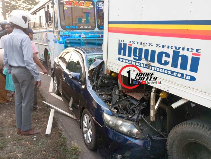 A multi-vehicle collision reported in the Kadawatha-Mahara area this morning resulted in a car becoming jammed between a bus and a lorry.