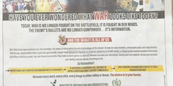 Media watchdog Freedom Network, the Human Rights Commission of Pakistan (HRCP), and other rights groups have condemned a government advertisement in major newspapers for portraying journalists, freelancers, NGO workers, and civil society actors as “threats” or instruments of “enemy propaganda”…