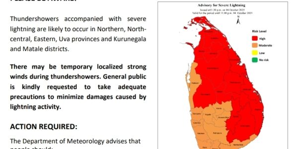 Thundershowers accompanied with severe lightning are likely to occur in Northern, North- central, Eastern, Uva provinces and Kurunegala and Matale districts. There may be temporary localized strong winds during thundershowers. General public is kindly requested to take adequate precautions to…