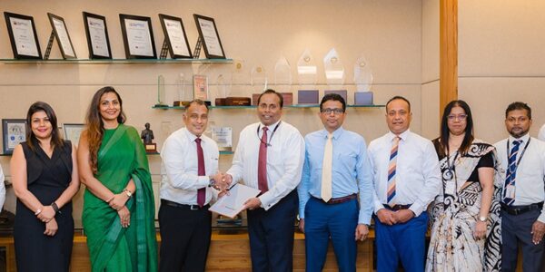 L to R: Mr. Ranjan Dahanayake, Deputy Managing Director – Sales and Marketing, Prime EV Automobiles (Pvt) Ltd (fourth from left), and Mr. Deepal De Silva, Chief Operating Officer, Sampath Bank (sixth from right), exchange the agreement in the presence…
