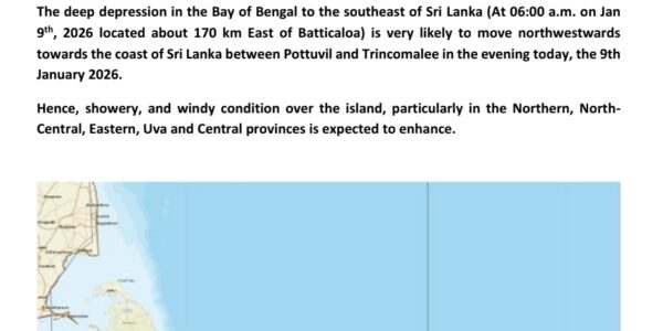 WEATHER FORECAST FOR 09 JANUARY 2026 Issued at 05.30 a.m. on 09 January 2026 The deep depression in the Bay of Bengal to the southeast of Sri Lanka (At 04:00 a.m. on Jan 9th 2026 located about 200 km South…