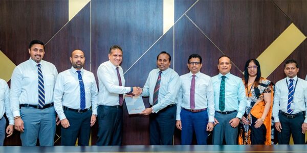 L to R: Mr. Dirk Joshua, Executive Director – Sales & Marketing, Sathosa Motors PLC (fourth from left), and Mr. Deepal De Silva, Chief Operating Officer, Sampath Bank (sixth from right), exchange the agreement in the presence of senior representatives…