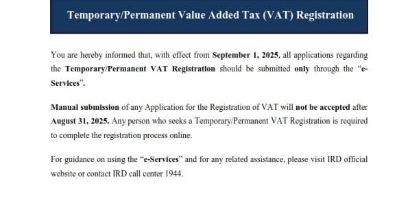 The Inland Revenue Department (IRD) announced that from September 1, 2025, all applications for Temporary and Permanent Value Added Tax (VAT) registration must be submitted exclusively through its online “e-Services” platform. The department said manual submissions will no longer be…