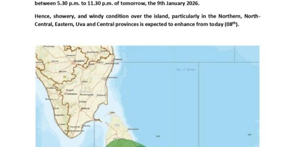 Warning for deep depression over South-east Bay of Bengal Sea area. Issued by the Natural Hazards Early Warning Centre, Department of Meteorology. Issued at 06.30 p.m. on 08 January 2026 for the period until 06.30 p.m. 09 January 2026 The…