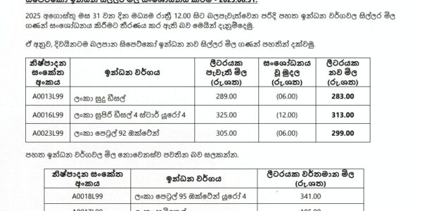 The Ceylon Petroleum Corporation announced that fuel prices will be revised with effect from midnight. Accordingly, the price of a litre of Auto Diesel has been reduced by Rs.6 to Rs.283, while Super Diesel has been reduced by Rs.12 to…