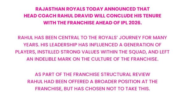 Rajasthan Royals have announced that head coach Rahul Dravid will step down from his role with the franchise ahead of IPL 2026. Dravid, who has been a key figure in the Royals’ journey for several years, has been credited with…