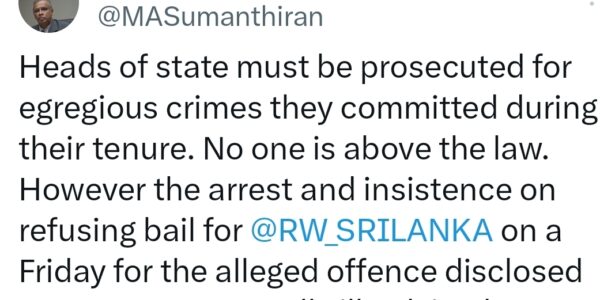 Former parliamentarian and ITAK General Secretary MA Sumanthiran PC said while heads of state must be prosecuted for serious crimes committed during their tenure, the arrest of former President Ranil Wickremesinghe on a Friday and the decision to oppose bail…