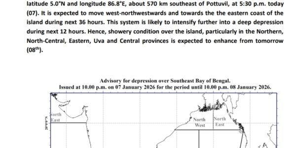 WEATHER FORECAST FOR 08 JANUARY 2026 Issued at 05.30 a.m. on 08 January 2026 The depression over the Bay of Bengal, located to the southeast of Sri Lanka, was centered near latitude 5.3°N and longitude 86.0°E, about 490 km southeast of…
