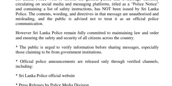Sri Lanka Police on Sunday issued a clarification warning the public about a message circulating on social media that is falsely attributed to the police. In a statement, police said the message, described as a “Police Notice” and containing a…