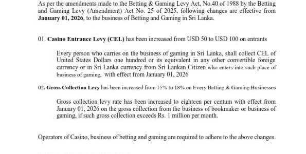 Sri Lanka’s Inland Revenue Department has announced an increase in casino entrance fees and betting and gaming levies, with the revised rates set to take effect from January 1, 2026. According to a notice issued on December 31, the Casino…