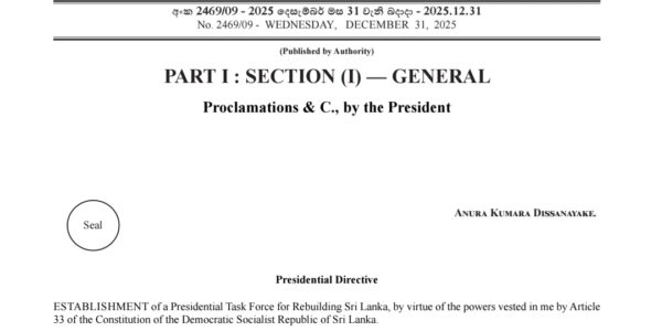 President Anura Kumara Dissanayake has issued an Extraordinary Gazette establishing a Presidential Task Force for Rebuilding Sri Lanka, aimed at coordinating post-disaster rehabilitation, recovery and reconstruction efforts following the devastation caused by Cyclone Ditwah. The gazette, dated December 31, appoints…
