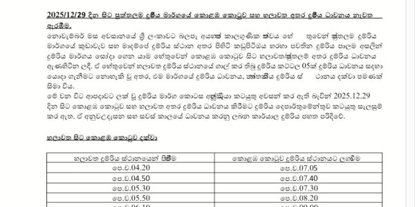 The Department of Railways has announced that train services on the Puttalam line, specifically between Colombo Fort and Chilaw, are scheduled to resume tomorrow, December 29th. Services on this line were severely disrupted following the extreme weather conditions that lashed…