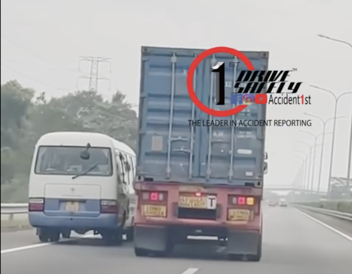 A container truck was seen driving dangerously on an expressway, forcing a tourist bus toward the side rail despite the bus slowing down to give way.