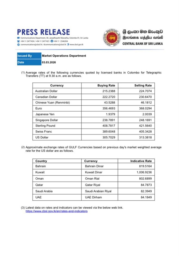 According to the Central Bank of Sri Lanka, the buying rate of the US Dollar has increased from Rs. 305.56 to Rs. 305.70, while the selling rate has also increased from Rs. 313.05 to Rs. 313.38.