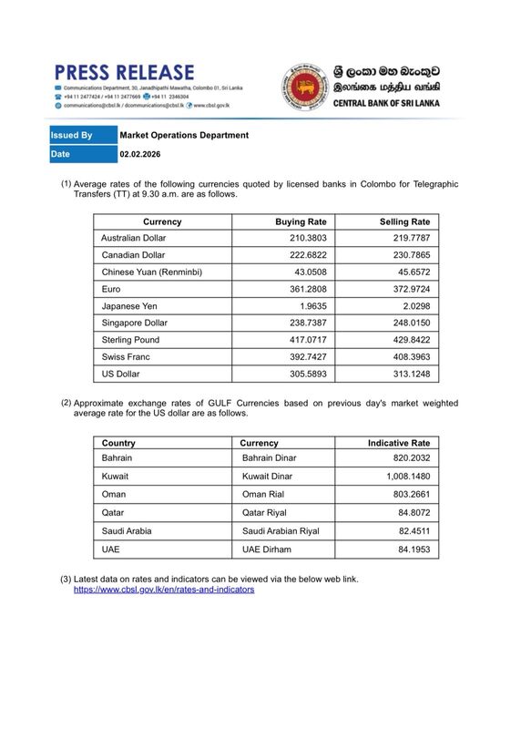 The Sri Lankan Rupee has appreciated against the US Dollar today (Feb 2), compared to Friday.