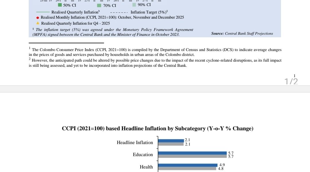The Colombo Consumer Price Index (CCPI, 2021=100) based headline inflation (year-on-year, Y-o-Y) remained unchanged at 2.1% in December 2025. This was primarily supported by the favourable statistical base effect, despite a substantial month-on-month increase in prices in December due to Cyclone Ditwah.