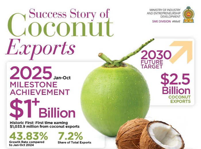 Pointing out that the coconut sector has now emerged as a strategic export crop, he said that with ongoing productivity reforms and sustained market development, Sri Lanka has the potential to reach USD 2.5 billion in coconut-based exports by 2030, emphasizing that the nation was firmly on track to achieve it. (Newswire)