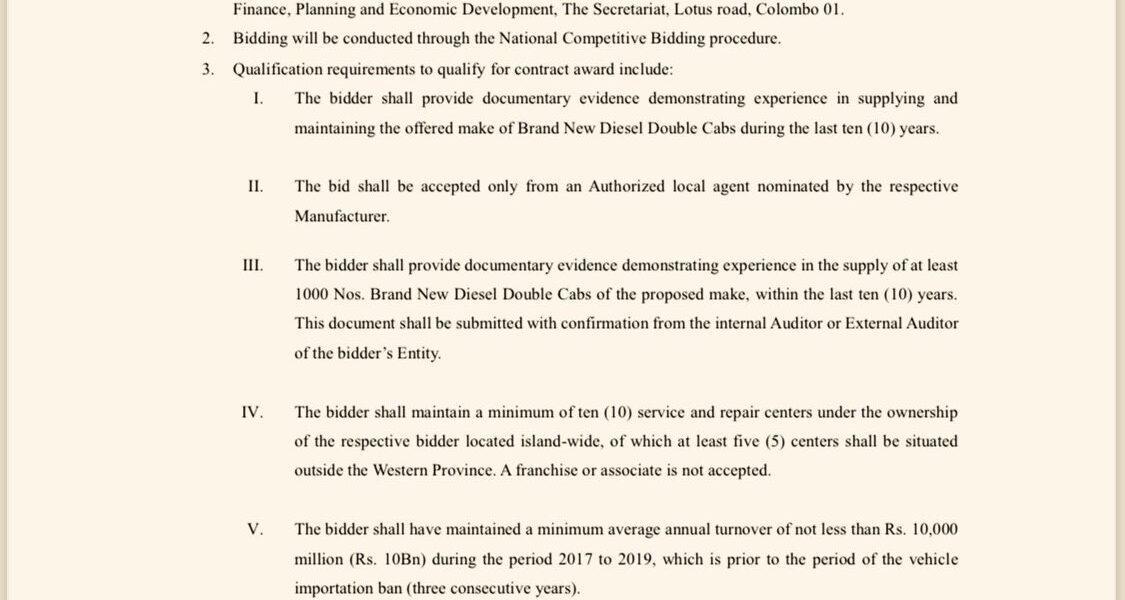 The bid document shows stringent eligibility criteria, including proof of supplying at least 1,000 similar vehicles in the past decade, a minimum of 10 service centers across the country, and a bid security of Rs. 50 million. (Newswire)