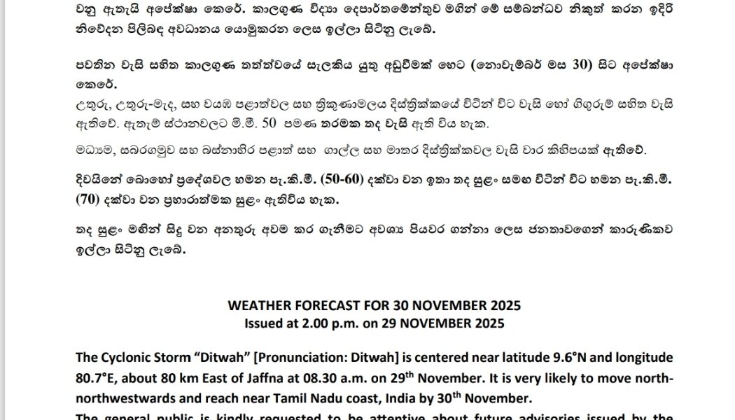 Director General of the Department of Meteorology Athula Karunanayake stated that although the cyclone has moved away from the island and its direct effects have diminished, the indirect effects are still present. He warned of the possibility of rainfall exceeding 100 mm in certain areas of the Northern, North Central, Eastern and Central Provinces.