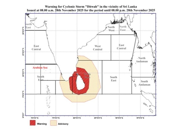 The Cyclonic Storm “Ditwah” is centred near latitude 8.1°N and longitude 81.2°E, about 50km South of Trincomalee, as of 08.00 am today.
