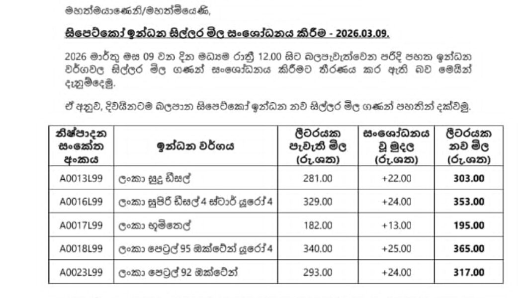 The Ceylon Petroleum Corporation has revised fuel prices with effect from midnight today (9).
