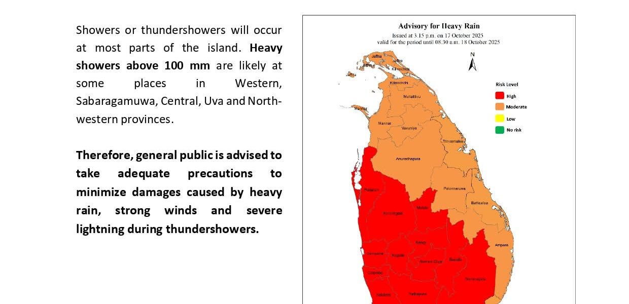 Showers or thundershowers will occur at most parts of the island. Heavy showers above 100 mm are likely at some places in Western, Sabaragamuwa, Central, Uva and North- western provinces.
