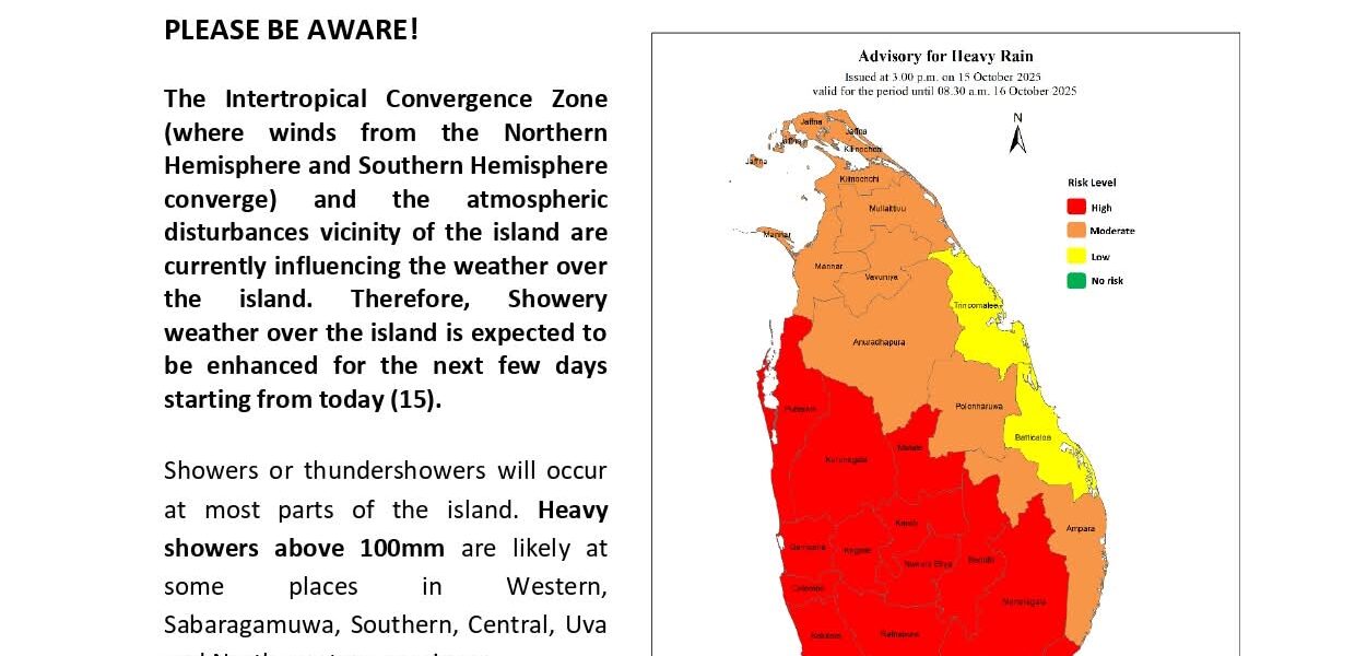 According to the advisory issued at 3:00 p.m. today (15) by the Natural Hazards Early Warning Centre, the Intertropical Convergence Zone (where winds from the Northern and Southern Hemispheres converge) and current atmospheric disturbances near the island are influencing Sri Lanka’s weather conditions.