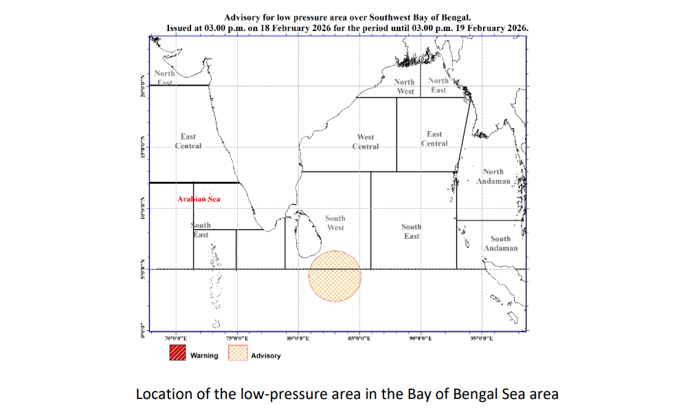 The Department of Meteorology has issued an Amber advisory for a low-pressure area persisting over the Southwest Bay of Bengal to the southeast of Sri Lanka.