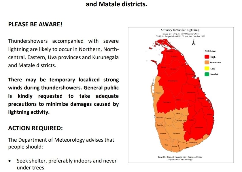 Thundershowers accompanied with severe lightning are likely to occur in Northern, North- central, Eastern, Uva provinces and Kurunegala and Matale districts.