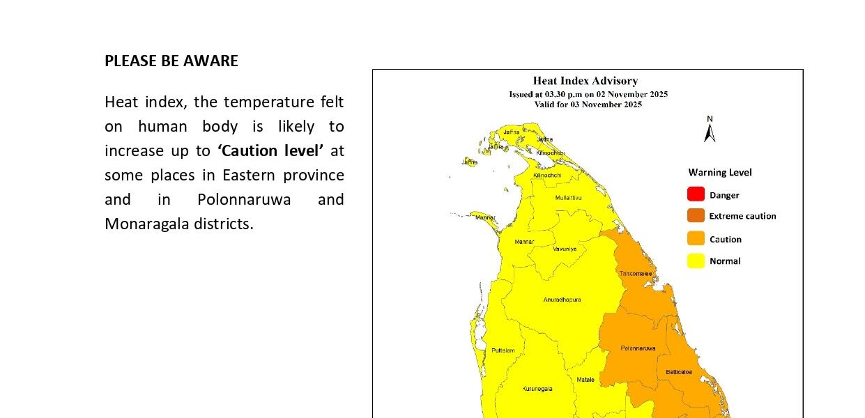 According to the advisory issued at 3:30 p.m. on November 2 and valid for November 3, 2025, the heat index — the temperature felt on the human body — is expected to increase up to the “Caution level” in several areas of the Eastern Province as well as the Polonnaruwa and Monaragala districts.