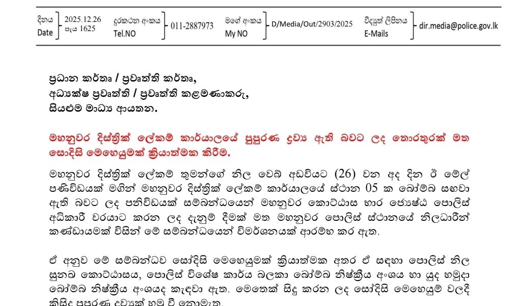 Police said the alert was received through an email sent to the official website of the Kandy District Secretary on December 26. Following the warning, the Senior Superintendent of Police in charge of the Kandy Division was informed, prompting an immediate investigation.