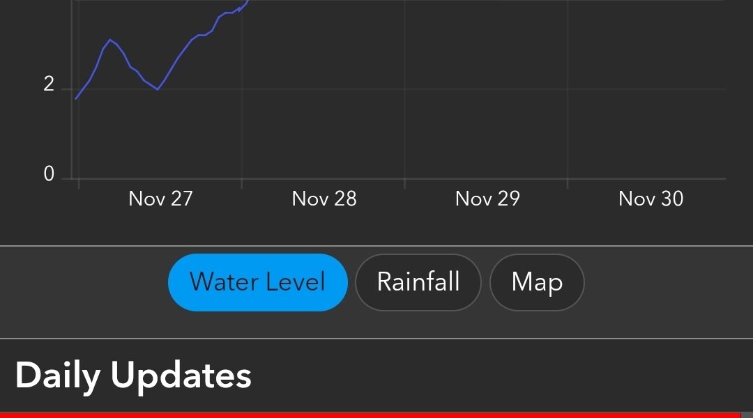 Water levels, which were at 7.65 feet at 7:03 p.m., increased to 7.80 feet by 8:04 p.m., 7.90 feet by 9:04 p.m., and reached 8.00 feet at 10:05 p.m., indicating continued upstream pressure moving toward the capital.
