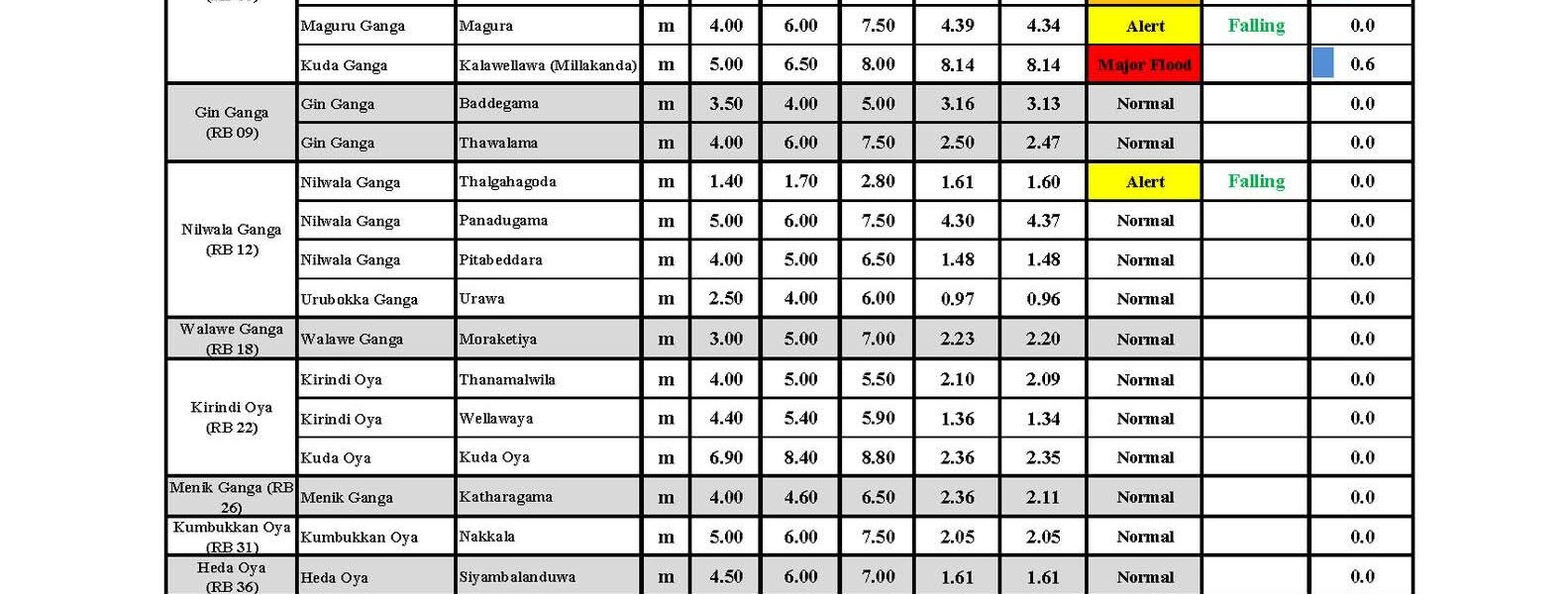 In the Kalu Ganga basin, water levels at Ratnapura have fallen slightly to 8.30 m, staying above minor flood level. Putupagala and Ellagawa are still on alert as levels remain elevated.